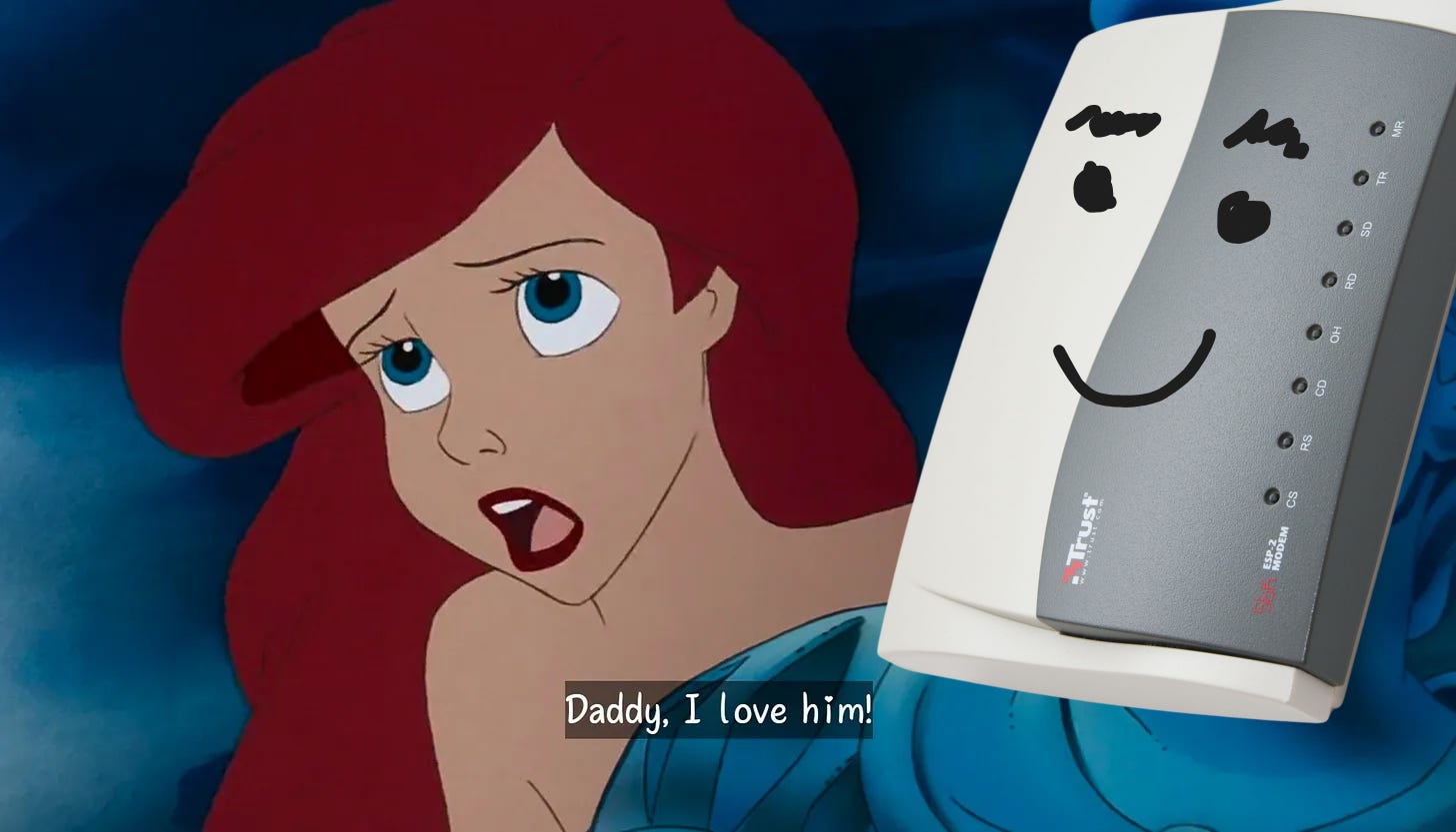 Tra i tredici e i ventitré anni circa, non poter accedere costantemente a Internet per me era una violazione delle Convenzioni di Ginevra. Dieci anni di tremori, frustrazioni, sotterfugi, attese, suppliche e scenate a mio padre, livello d’intensità: la Sirenetta.